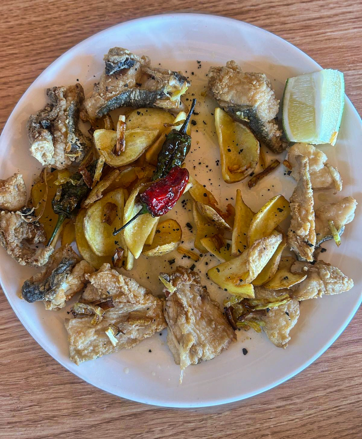 Ternera a la plancha con patatas fritas, tomate y pimientos de padrón.